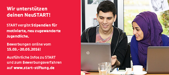 Gefördert werden mit dem Stipendienprogramm NeuSTART junge Zuwanderer, die nicht länger als fünf Jahre in Deutschland leben und Interesse an schulischer und persönlicher Weiterentwicklung haben. START begleitet diese Jugendlichen drei Jahre lang auf ihrem Bildungsweg und vermittelt ihnen durch individuelle Beratung und Begleitung, Bildungsseminare und das Stipendiaten-Netzwerk Schlüsselqualifikationen für die schulische und berufliche Laufbahn.